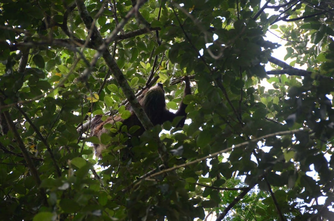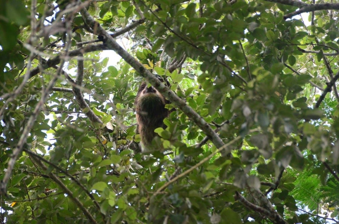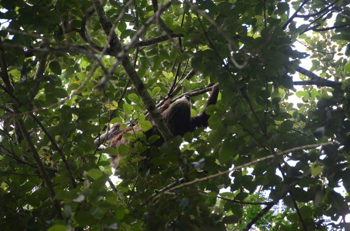 Pablo nous invite à détecter les paresseux: des masses marron au sommet des arbres. Nous repérons le premier. D’un geste lent mais clairement dirigé, il avance son long bras vers la cime voisine de l’arbre et saisit de sa longue griffe recourbée les feuilles du sommet. Puis avec la même lenteur, il la dirige vers sa bouche pour s’en délecter. Un déjeuner où il faut savoir être patient certainement, mais le paresseux a tout son temps.
