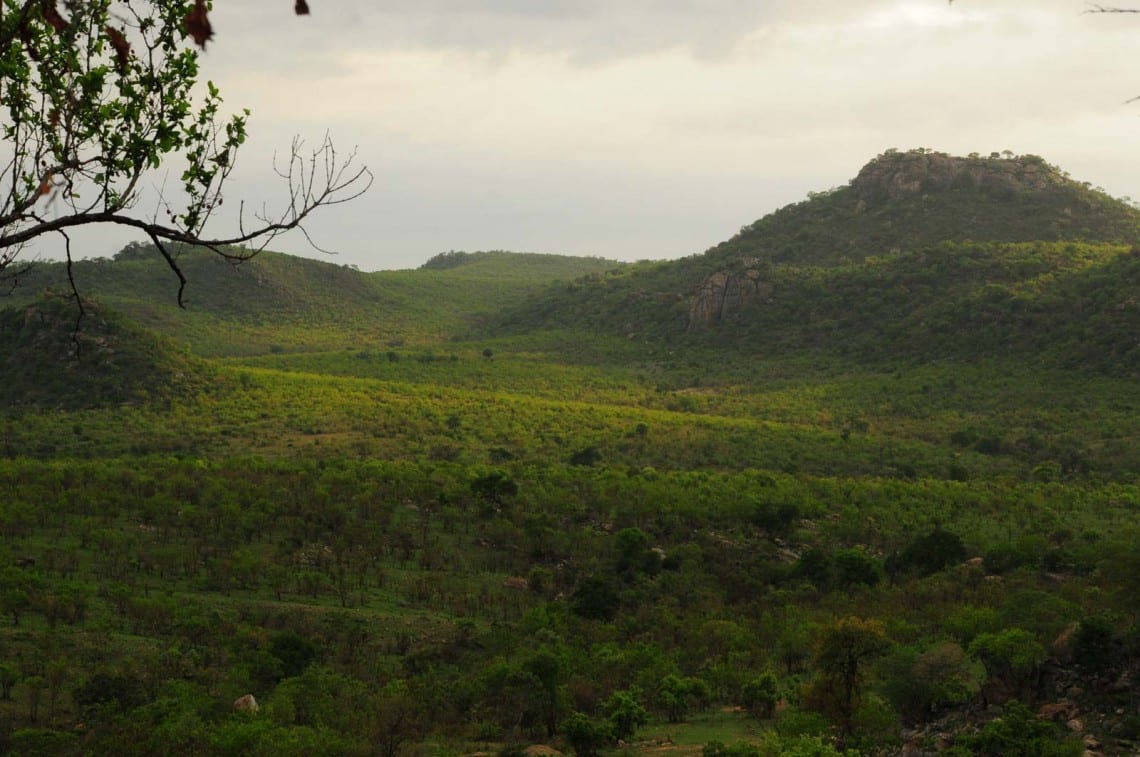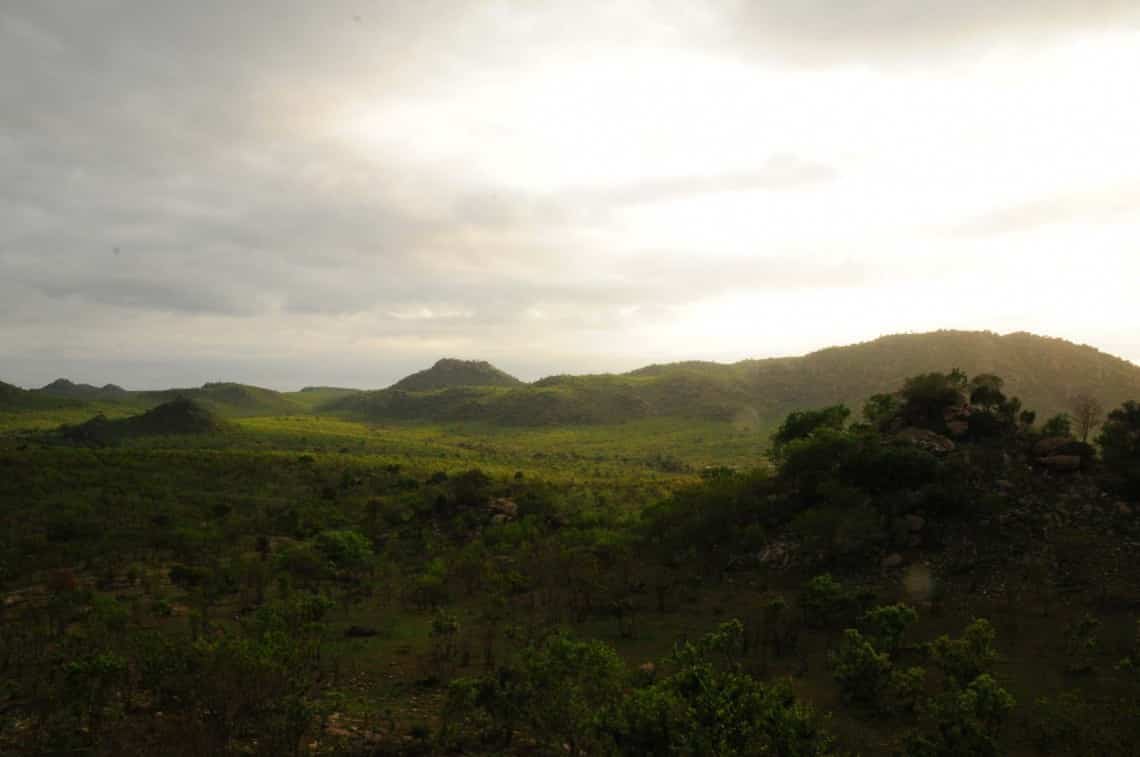 Puis après un long silence, les deux rhinos nous dévisagent et s’éloignent d’un pas lent et lourd. Nos guides nous font signe de nous lever et de nous remettre en route. Nous gravissons une colline rocailleuse. Elle n’est pas bien haute et nous nous trouvons rapidement devant un panorama de collines recouvertes d’un magnifique tapis de végétation rendu émeraude par la rosée du matin.
